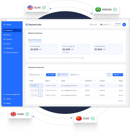 Receive funds via ACH, direct deposit, prepaid card, digital wallet, or your local payment method.